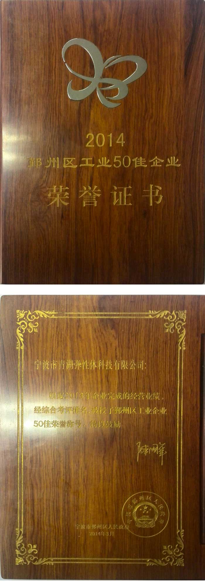 2014年6月18日,寧波市青湖彈性體科技有限公司獲得鄞州區(qū)人民政府頒發(fā)授予的“2014鄞州區(qū)工業(yè)50佳企業(yè)”榮譽(yù)證書。